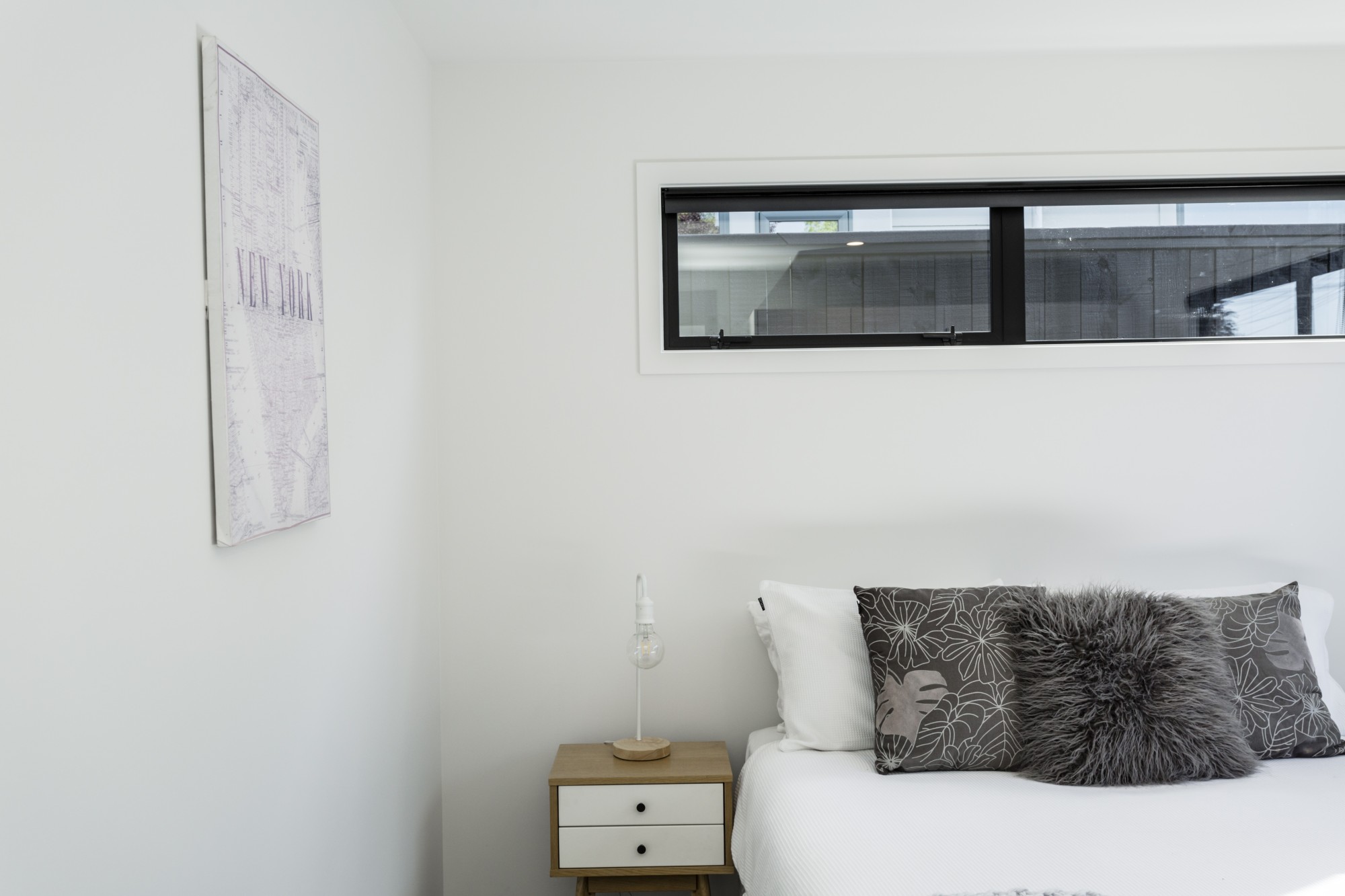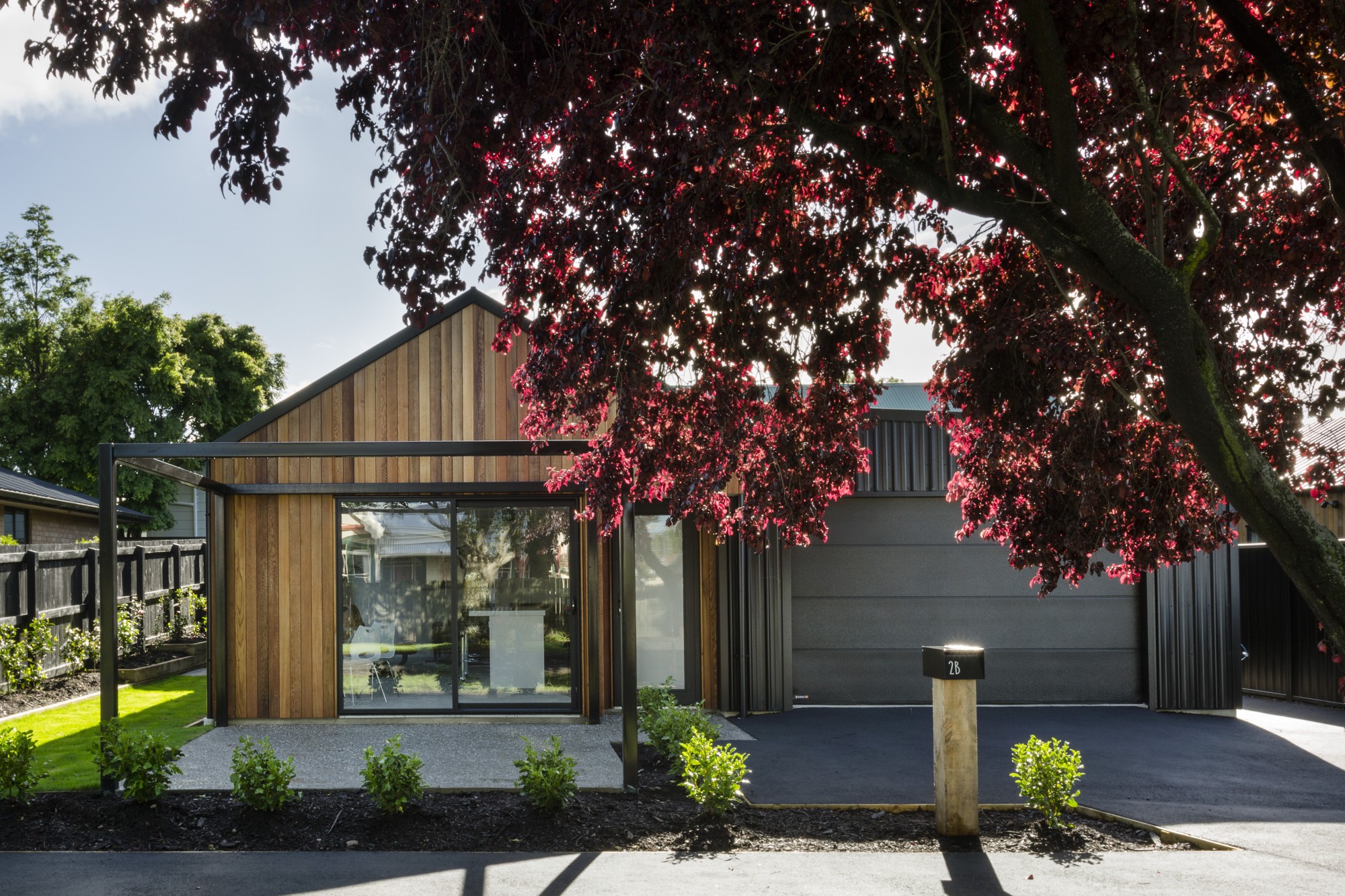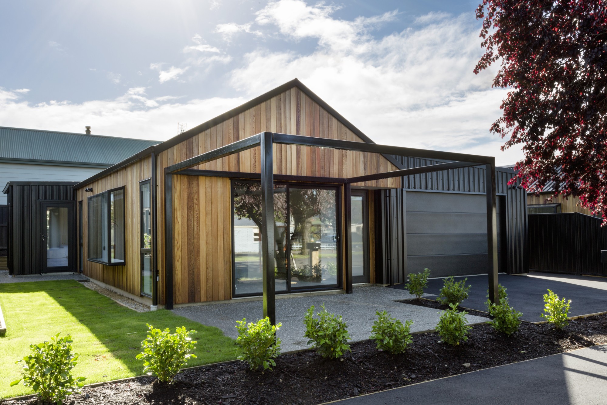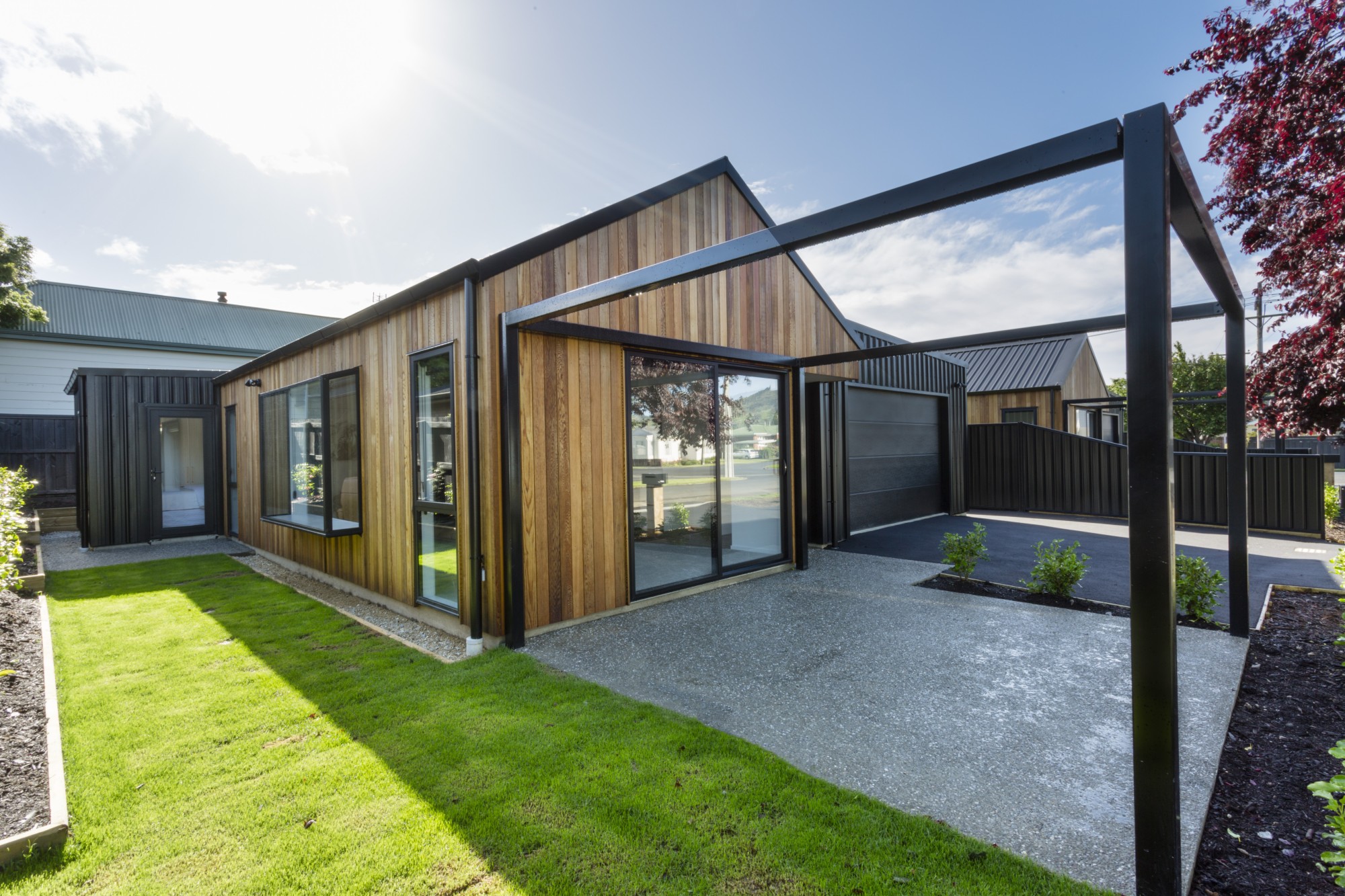 Showcasing clean gable and lean-to rooflines that nod to timeless heritage forms, the homes are elevated by a sleek material palette of vertical cedar tongue-and-groove and black vertical Colorsteel. Cleverly positioned to maximise the site, each residence features light-filled open-plan living under striking skillion ceilings, flowing seamlessly to private outdoor spaces.