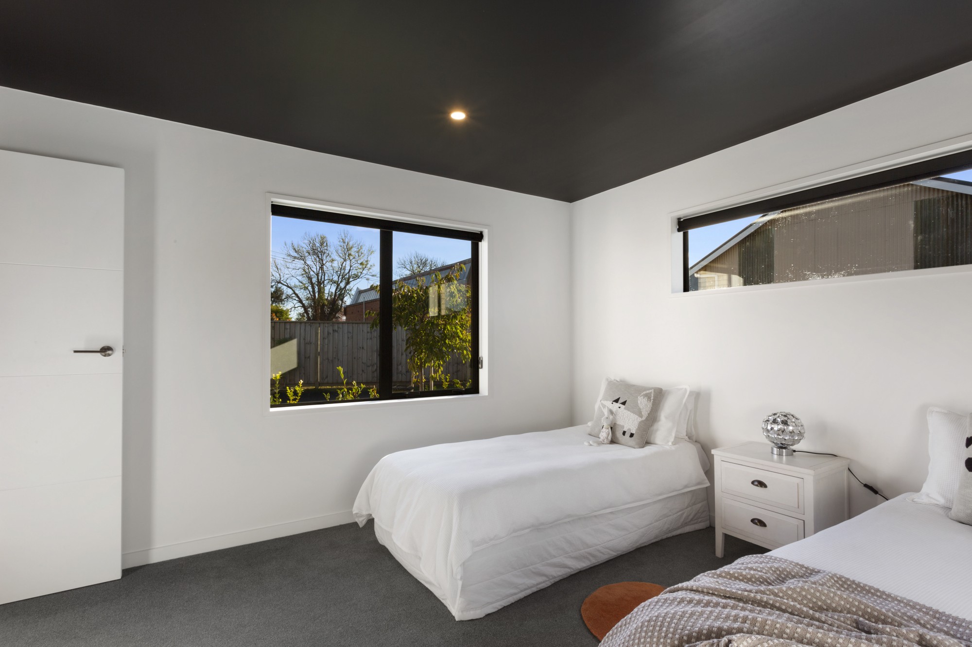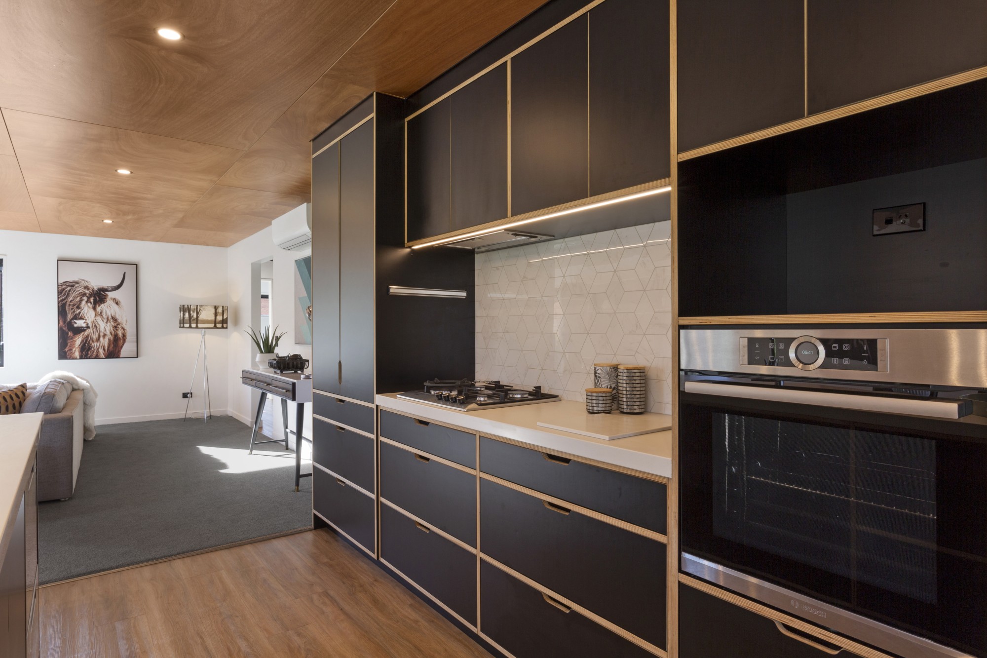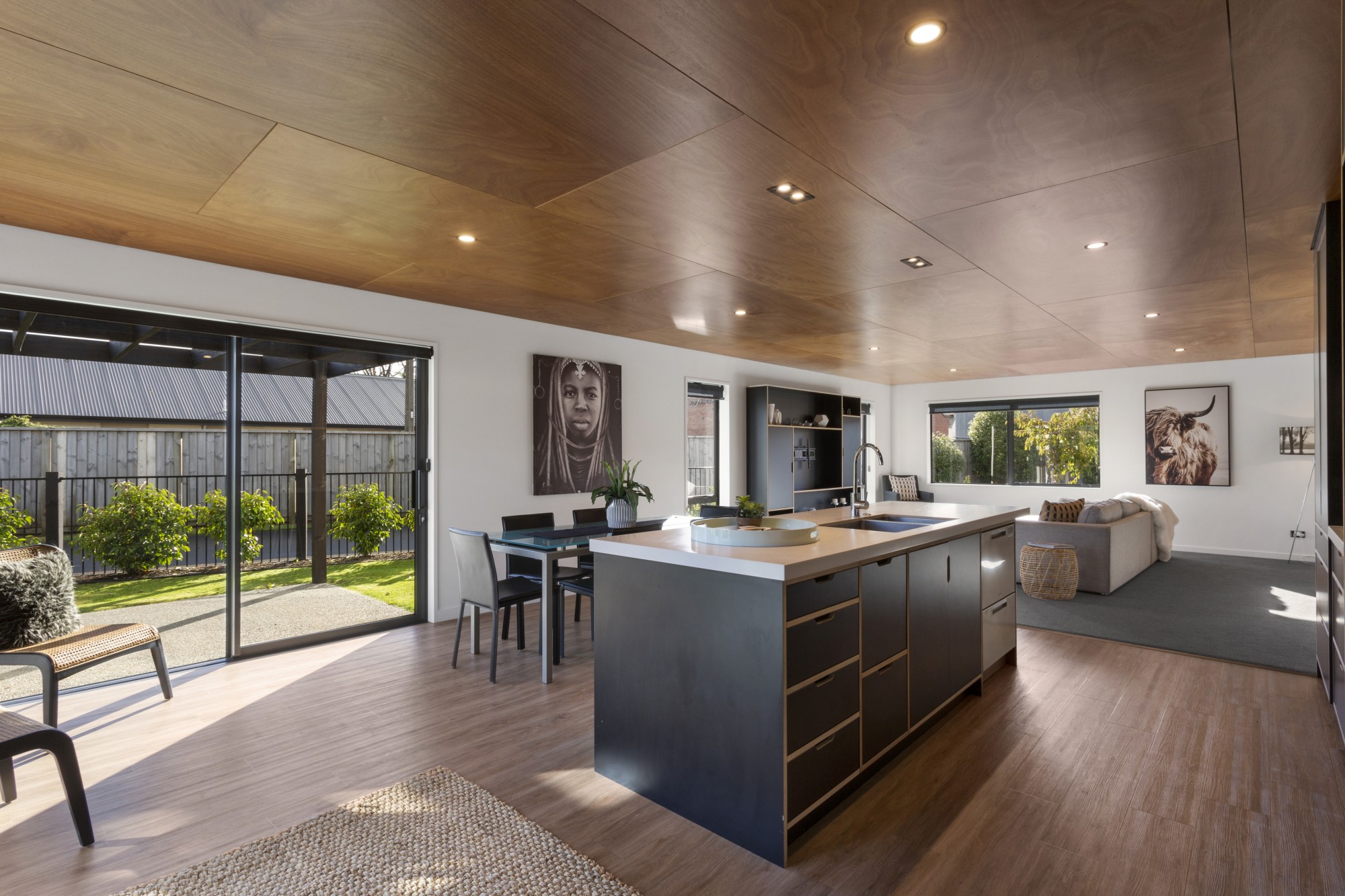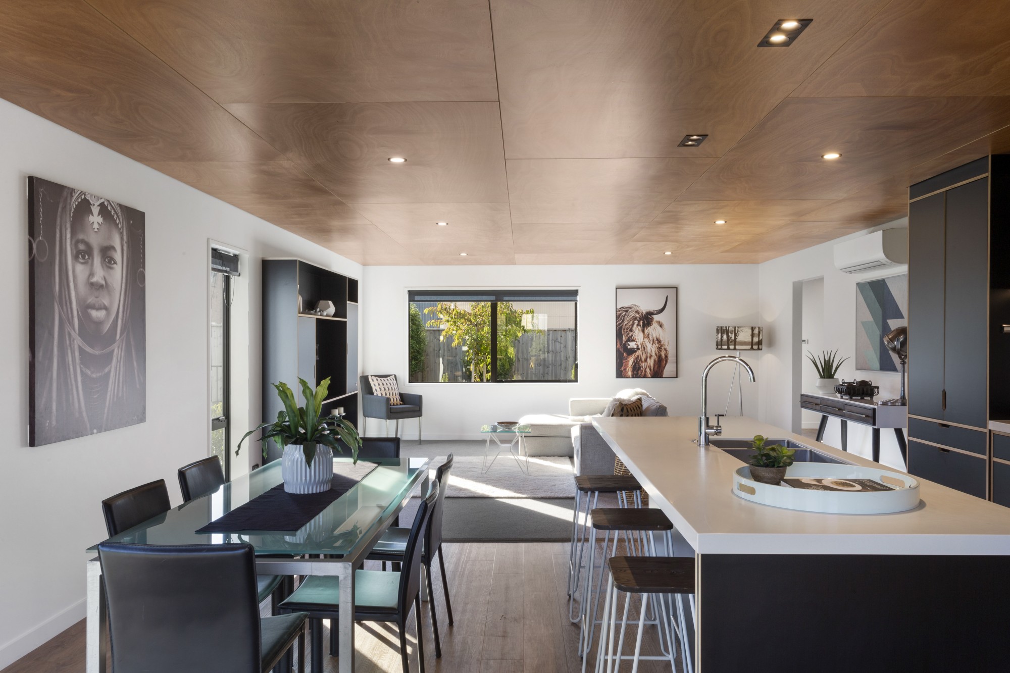 Featuring a dramatic single mono-pitch roof and a bold mix of hardy architectural brick and cedar weatherboards, the home makes a confident statement from the street. Inside, black plywood joinery and black ceilings bring a moody richness, while warm ply ceilings in the open-plan living area add a natural, grounding touch.