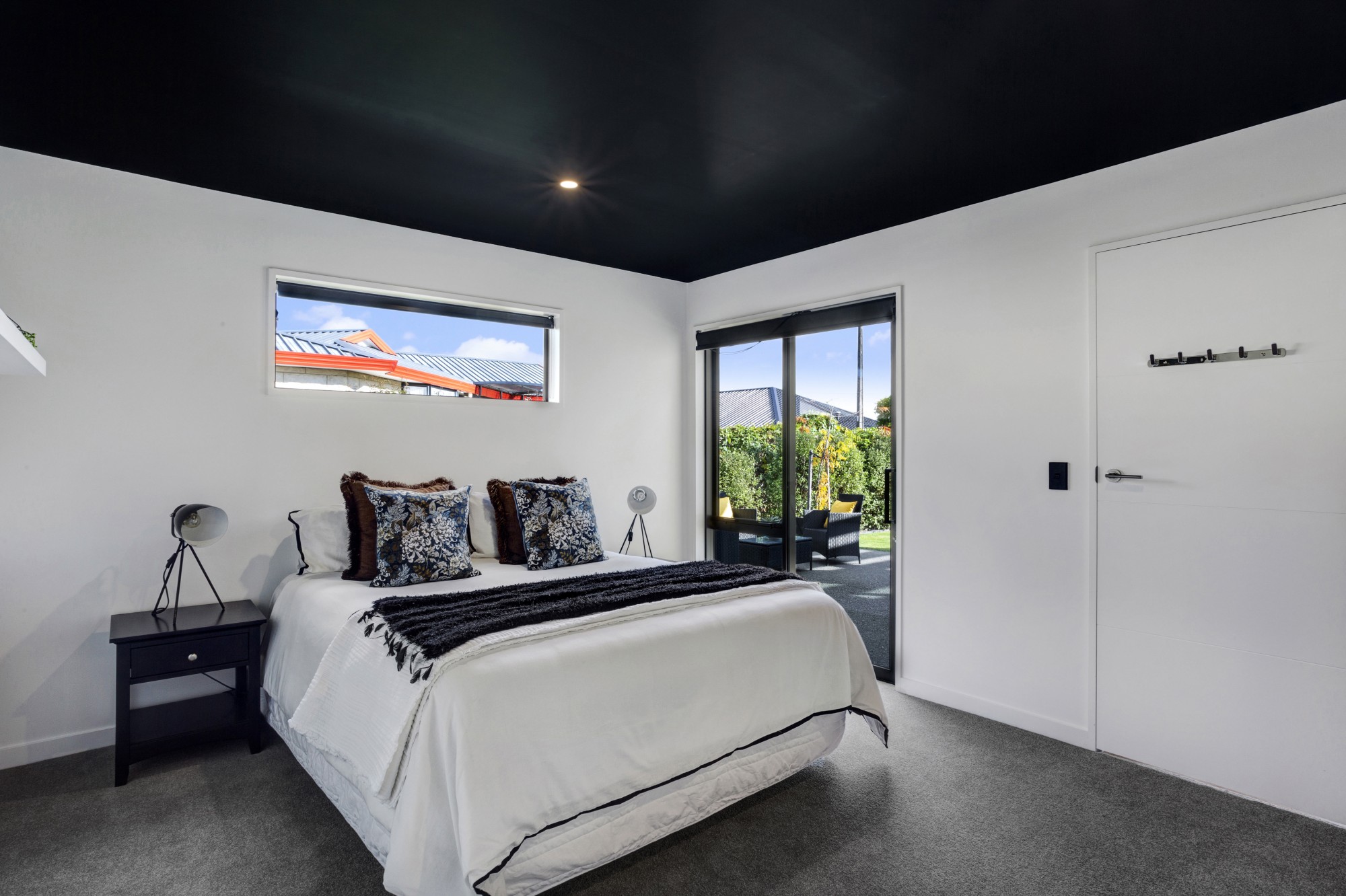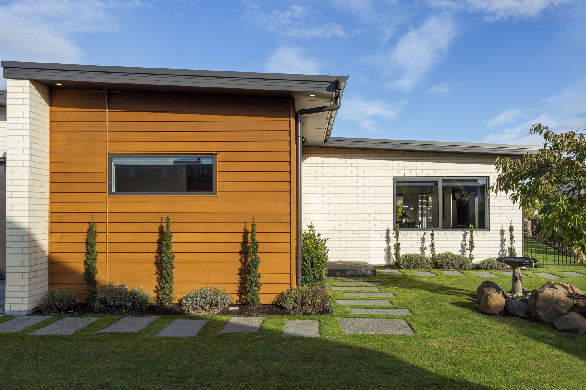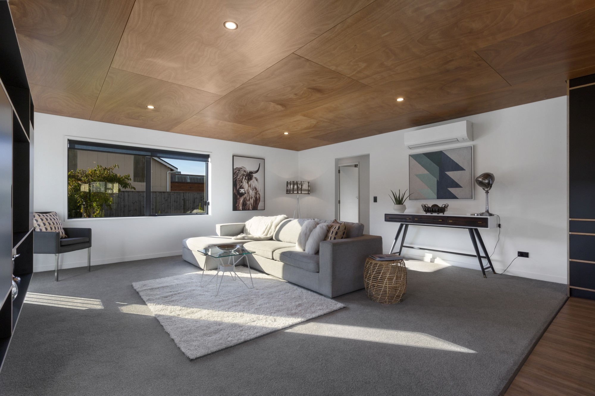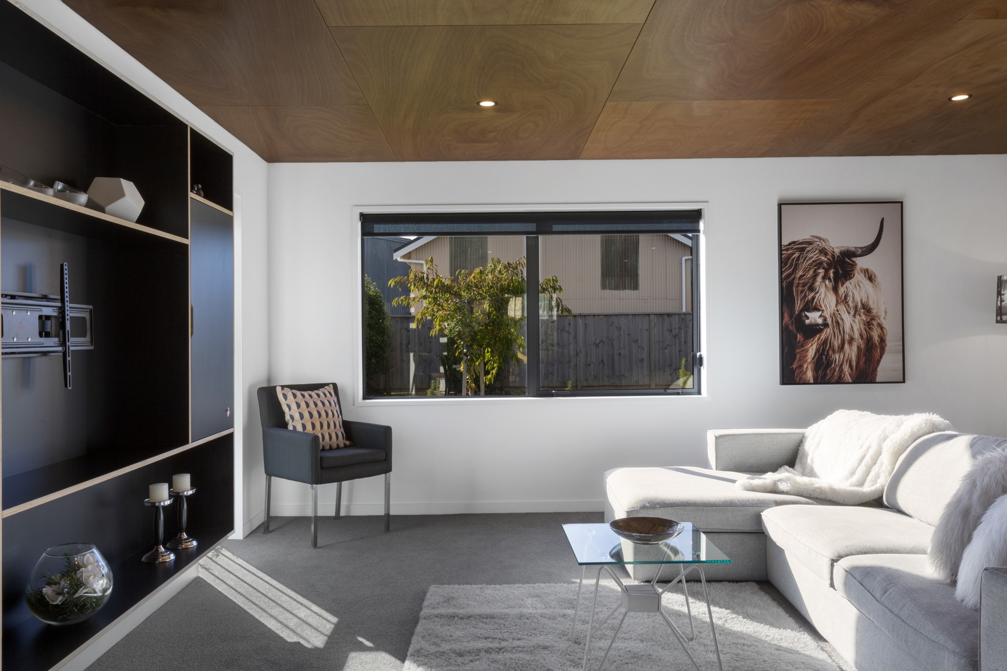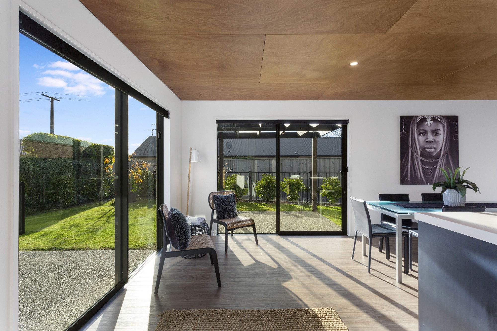 Featuring a dramatic single mono-pitch roof and a bold mix of hardy architectural brick and cedar weatherboards, the home makes a confident statement from the street. Inside, black plywood joinery and black ceilings bring a moody richness, while warm ply ceilings in the open-plan living area add a natural, grounding touch.